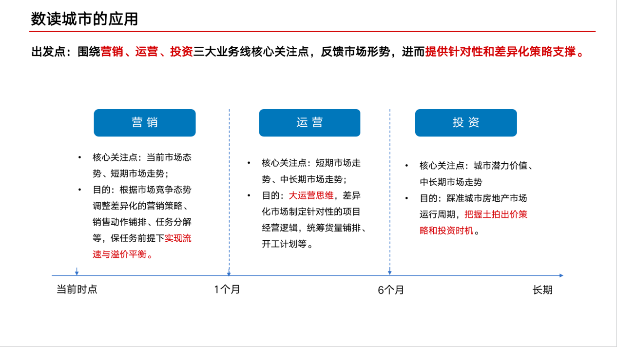 在数读城市的应用这一部分,陈丰雁用“拥抱新变化、迎接新常态”来做总结,并围绕营销、运营、投资三大业务线核心关注点,反馈市场形势,进而提供针对性和差异化策略支撑。