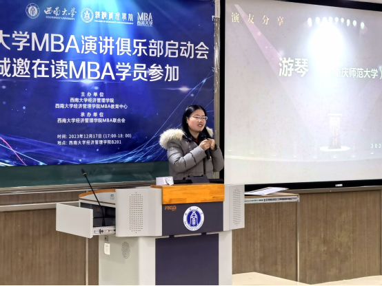 俱乐部联合发起人、2023级大成班夏小斐同学表示,俱乐部的创立得到了公司领导的高度认可与支持,同时也离不开金绍荣主任、颜莉娟老师、白秋梅老师和李若男老师的悉心指导,更离不开创始人谭和琼学姐的辛勤付出。她强调,俱乐部的成立旨在汇聚更多志同道合的朋友,共同绽放出属于MBA人的智慧和魅力。她希望演讲俱乐部能成为一个对同学们具有真正价值、能够互相成就的交流平台。她鼓励大家“不忘初心,不负韶华,追求卓越的同时,不忘做一个温暖的人。”