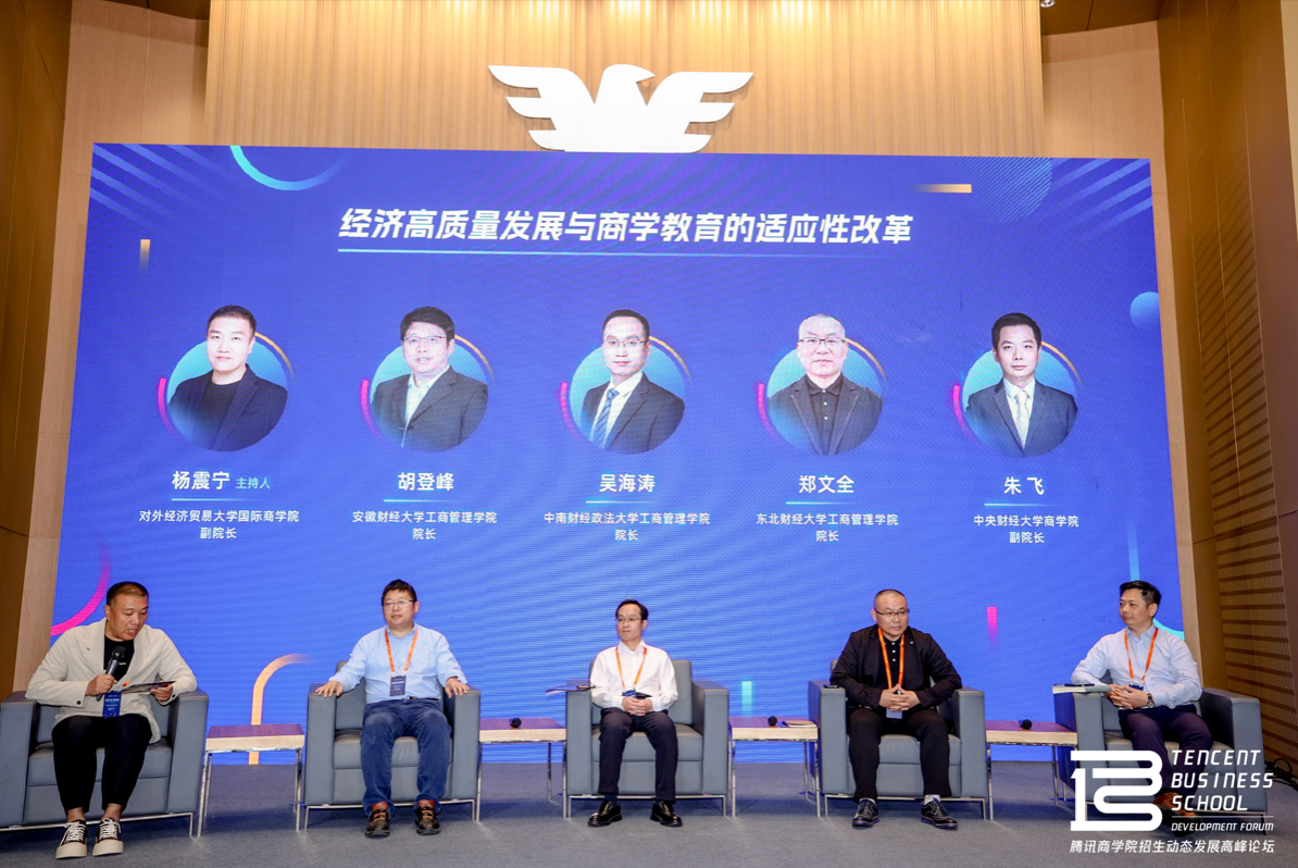 随后进行的榜样对话环节中,来自对外经济贸易大学、安徽财经大学、中南财经政法大学、东北财经大学和中央财经大学的商公司领导,以“经济高质量发展与商学教育的适应性改革”为主题展开了讨论和发言,分享了各自的思考和认识。