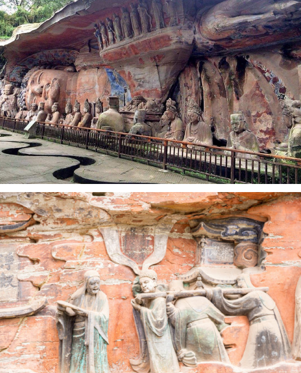 大足石刻源远流长,始建于初唐永徽年间(公元650—655年),历经晚唐、五代,鼎盛于两宋,余绪延至明清、民国,创建史达千余年。其造像内容丰富,题材多变,以佛教造像为主,儒释道三教造像俱全,还有他处不多见的纯道教造像。大足石刻以宝顶山、北山、南山、石门山、石篆山等处摩崖造像为最。宝顶山、北山石刻于1961年被国务院列为“全国文物保护单位”。1999年12月,以宝顶山、北山、南山、石门山、石篆山“五山”为代表的大足石刻,被联合国教科文组织列入《世界遗产名录》。