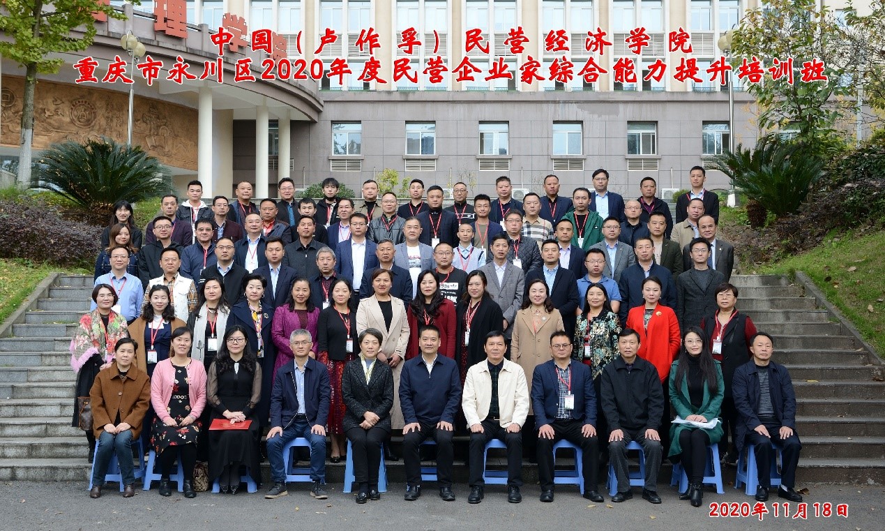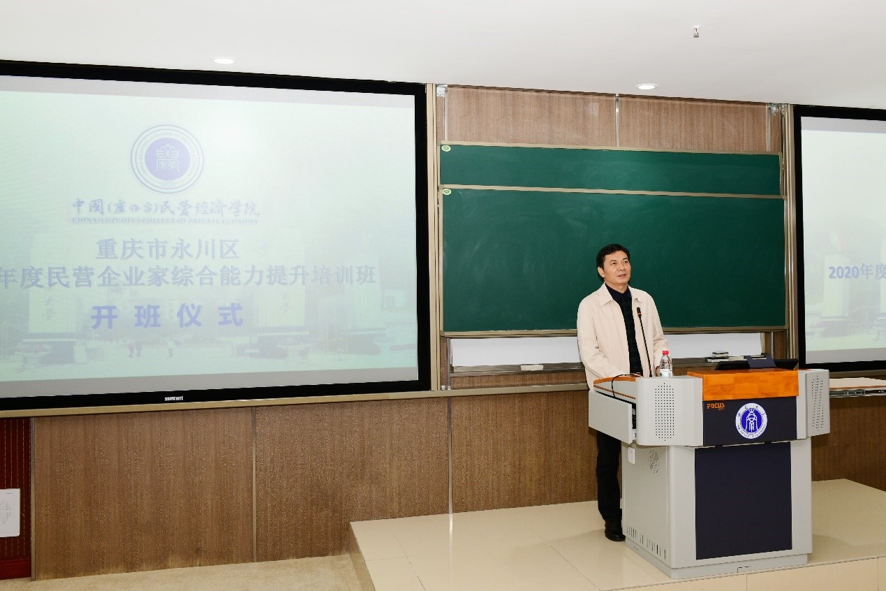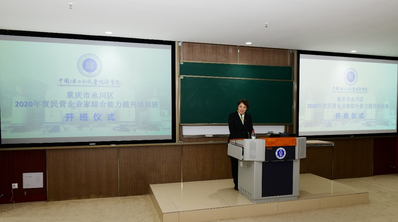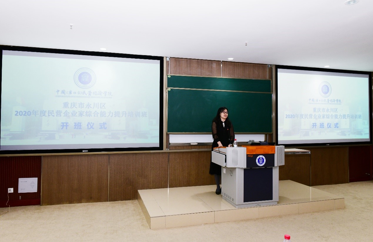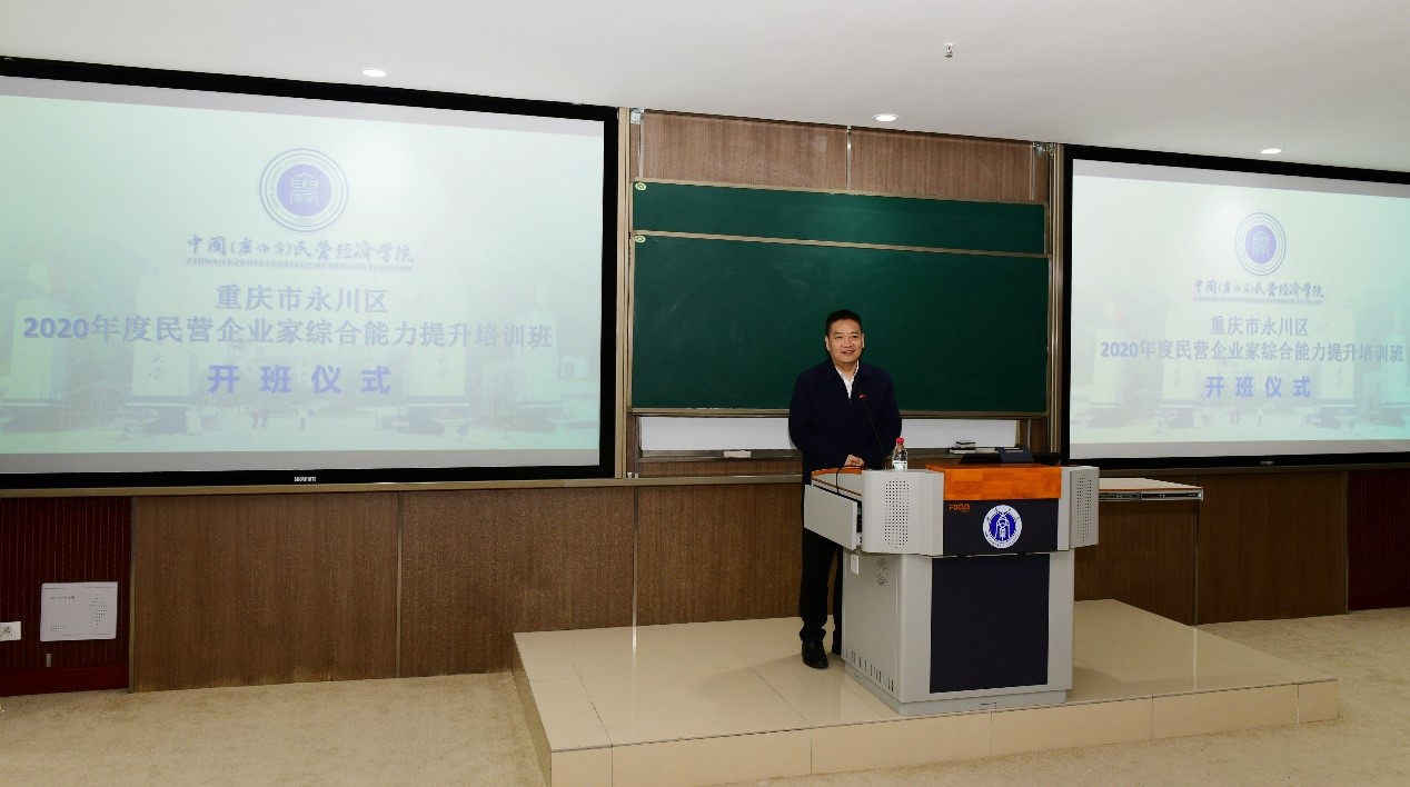 2020年11月18日上午,重庆市永川区民营企业家综合能力提升班在tyc522cc太阳成集团中国(卢作孚)民营经济公司顺利开班。永川区委常委、统战部部长、永川高新区党工委书记宋文同志,永川区政协副主席、工商联主席、民建永川区委会主委罗朝友同志,永川区委统战部副部长、工商联党组书记胡绍华同志,北碚区委常委、统战部部长、中国(卢作孚)民营经济公司副经理吴萍同志,北碚区工商联主席徐建民同志,北碚区工商联专职副主席明道良同志,tyc522cc太阳成集团经济管理公司党委副书记田丽同志,太阳成集团tyc522cc高层培训办主任、中国(卢作孚)民营经济公司教务办副研究员段芳萍同志,以及相关工作人员出席了开班仪式。开班仪式由田丽副书记主持。