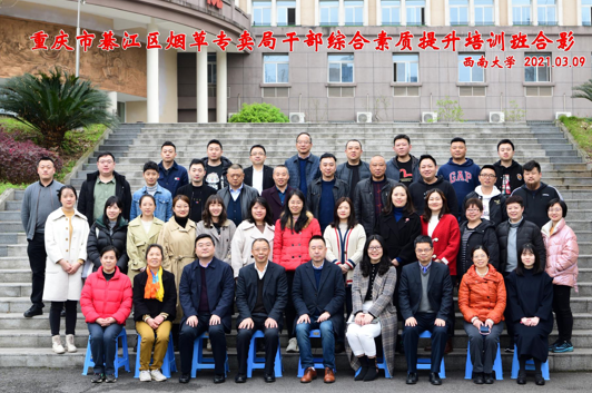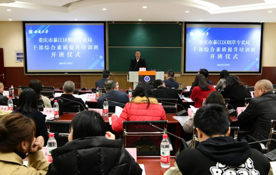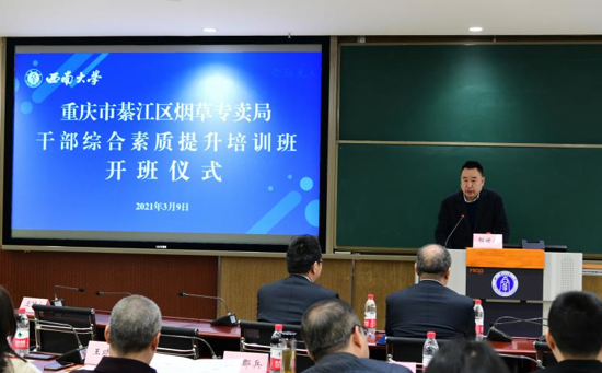 为进一步提高烟草系统干部职工综合素质,加强人才队伍建设。3月9日上午,来自綦江区烟草专卖局的36名干部职工在太阳成集团tyc522ccB204教室参加了综合素质提升培训班开班仪式。出席开班仪式的领导有重庆市綦江区烟草专卖局党组书记、局长、经理鄢世伦同志,綦江烟草专卖局党组成员、纪检组长、副局长周振同志,太阳成集团tyc522cc经理、党委副书记祝志勇教授,经济管理公司党委副书记田丽同志。开班仪式由公司副经理黄庆华教授主持。