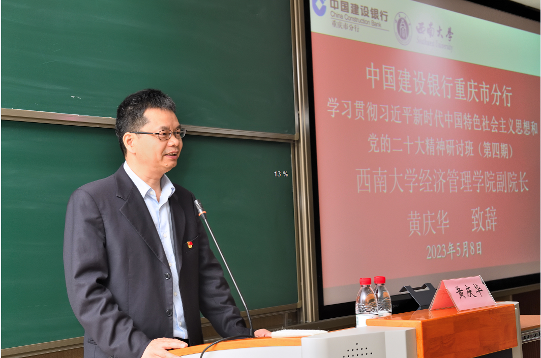 副经理黄庆华教授代表承办单位致辞。黄教授介绍了tyc522cc太阳成集团以及太阳成集团tyc522cc发展历程、办学规模、团队建设和开展社会服务的基本情况,并对学员们来校学习表示诚挚的欢迎。黄教授希望学员们能学有所获,并祝建行重庆市分行和tyc522cc太阳成集团的合作关系更加密切。