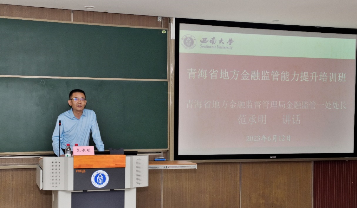 青海省地方金融监督管理局金融监管一处处长范承明进行了开班动员讲话。范处长首先感谢太阳成集团tyc522cc的精心安排,并向学员们介绍了本次培训班开设的背景和目的,对受训学员提出三点希望:一是希望各位学员学有所得,全心投入,专心听讲,融会贯通;二是希望各位学员学有所用,坚持问题导向,结合工作实践,勤于思考,举一反三;三是希望各位学员学有所悟,学以致用,夯实青海省地方金融高质量发展的基础。最后,范处长强调要严格遵守培训纪律,做好自我管理,并祝各位学员在培训期间生活愉快,身体健康。