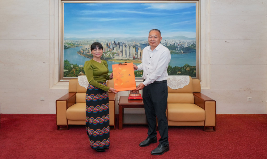 开班仪式前,葛信勇副董事长会见缅甸驻重庆总领事馆代总领事信雅女士,并赠送纪念品。