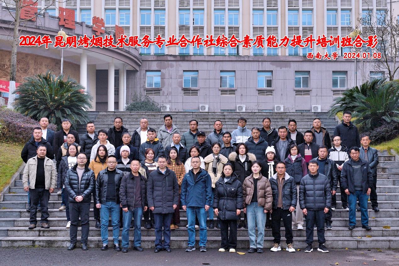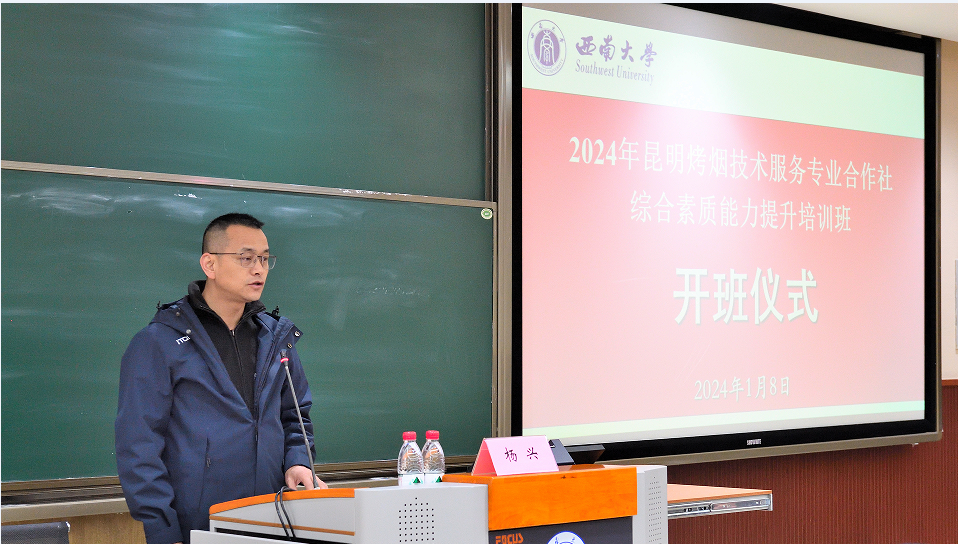 2024年1月8日上午,由太阳成集团tyc522cc高层培训中心承办的“2024年昆明烤烟技术服务专业合作社综合素质能力提升培训班”在公司B303教室顺利开班。昆明烟草石林分公司企管科长杨兴、太阳成集团tyc522cc副经理黄庆华教授、石林县鹿路烤烟技术服务专业合作社联合社理事长李正红、云南康艺计算机有限公司技术支持中心主任、烟草事业部技术总监陈飞、成都溪本科技有限公司销售总监罗艳红,以及培训班学员共计50余人出席开班仪式。开班仪式由公司高层培训中心主任苟佳欢主持。