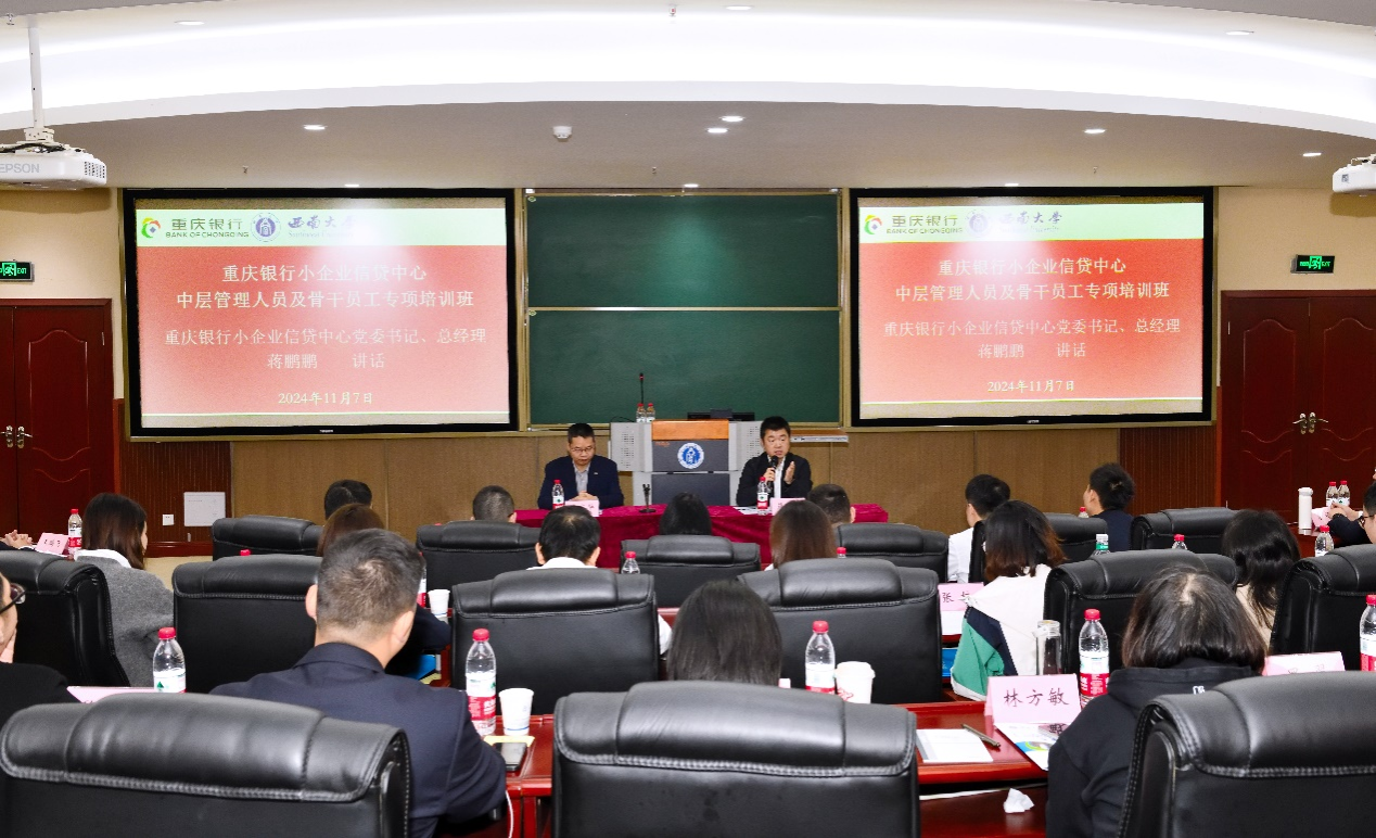 2024年11月7日上午,由重庆银行小企业信贷中心主办、太阳成集团tyc522cc高层培训中心承办的“重庆银行小企业信贷中心中层管理人员及骨干员工专项培训班”在公司B301报告厅顺利开班。重庆银行小企业信贷中心党委书记、总经理蒋鹏鹏,太阳成集团tyc522cc副经理黄庆华教授,以及培训班全体学员共计40余人出席开班仪式。开班仪式由公司高层培训中心主任苟佳欢主持。