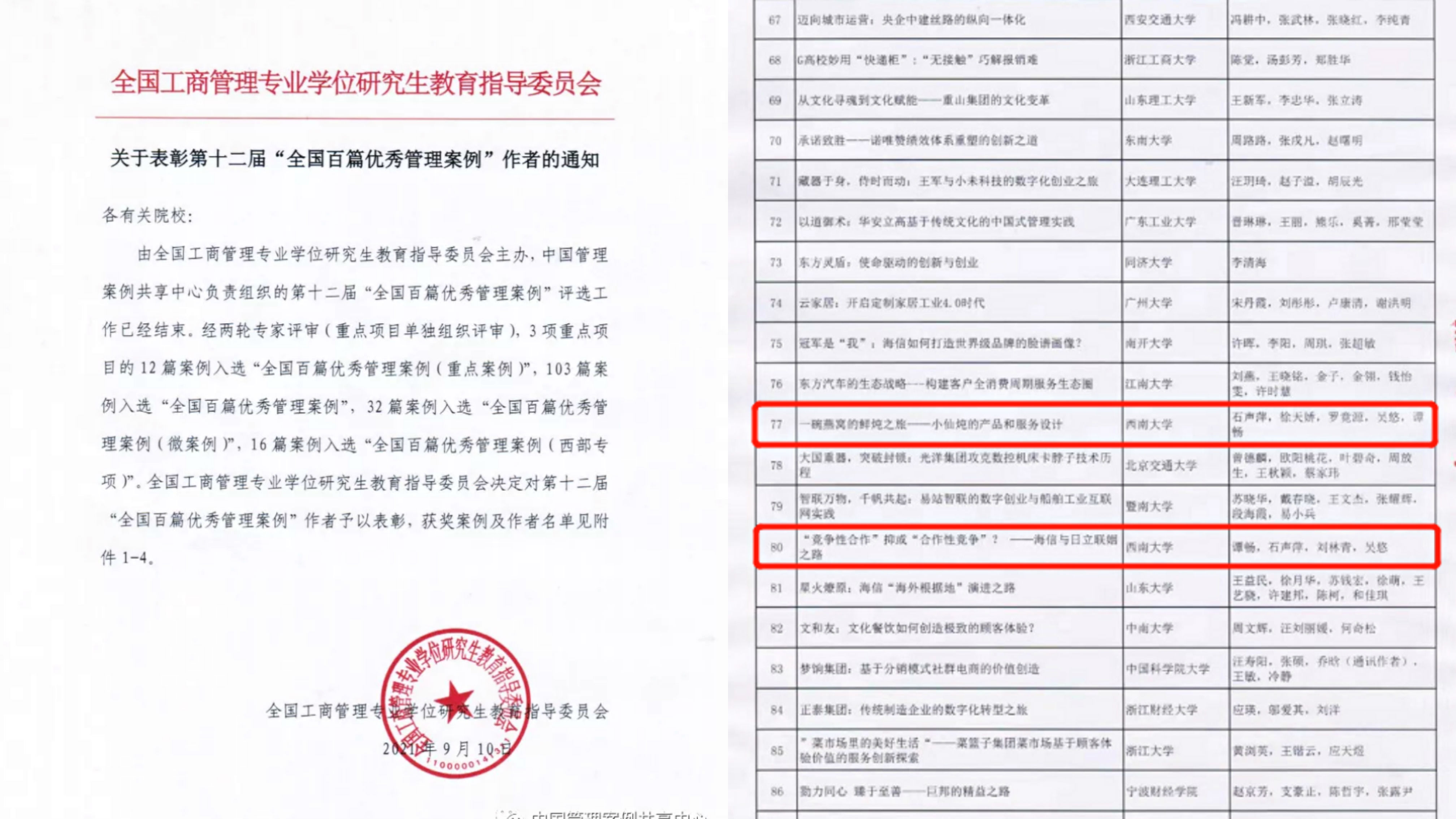 2021年9月10日,由全国工商管理专业学位研究生教育指导委员会主办、中国管理案例共享中心承办的第十二届“全国百篇优秀管理案例”评选结果出炉。公司推荐参选的19篇教学案例,有5篇被评为第...